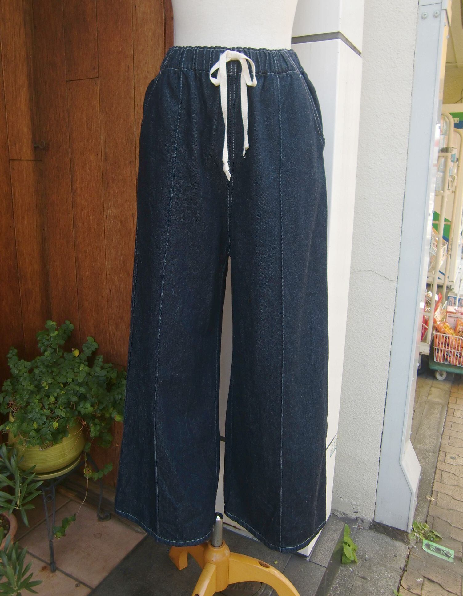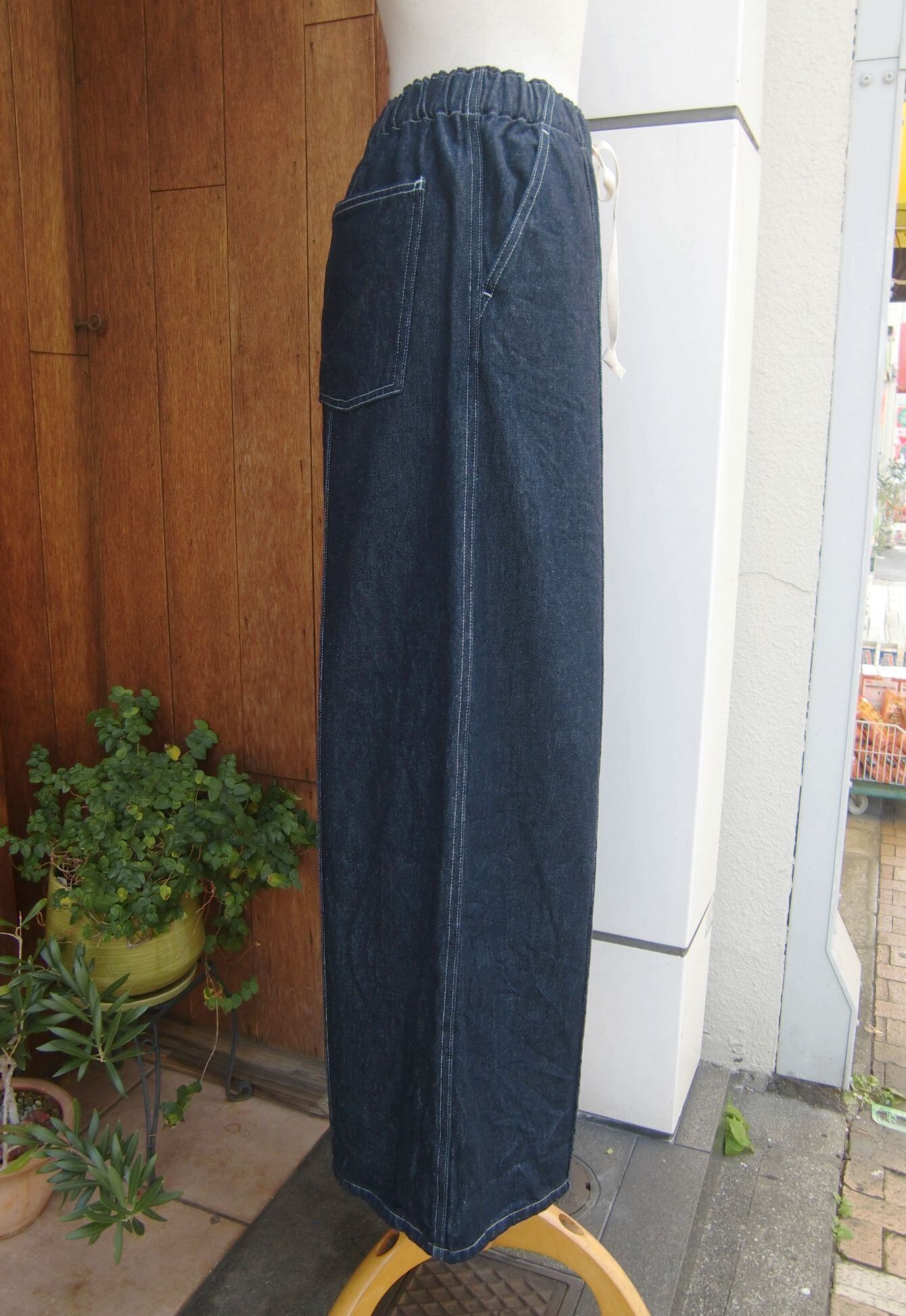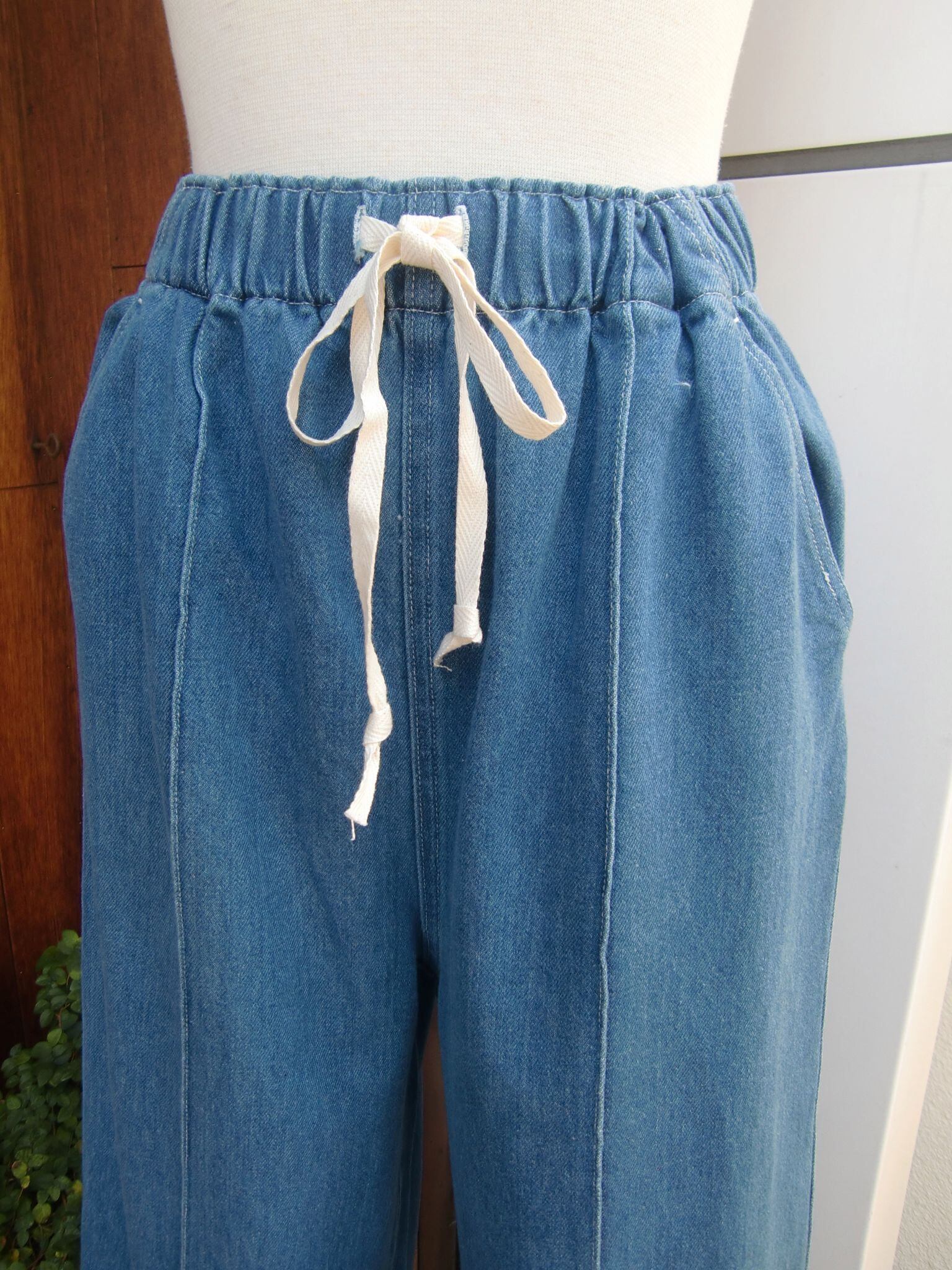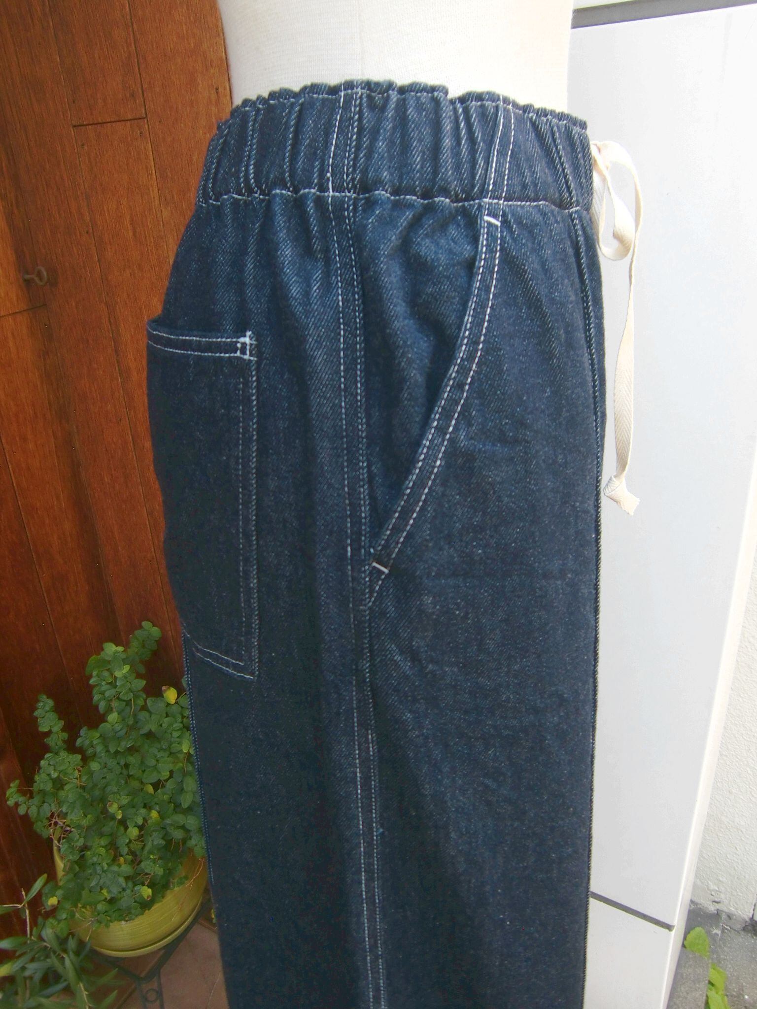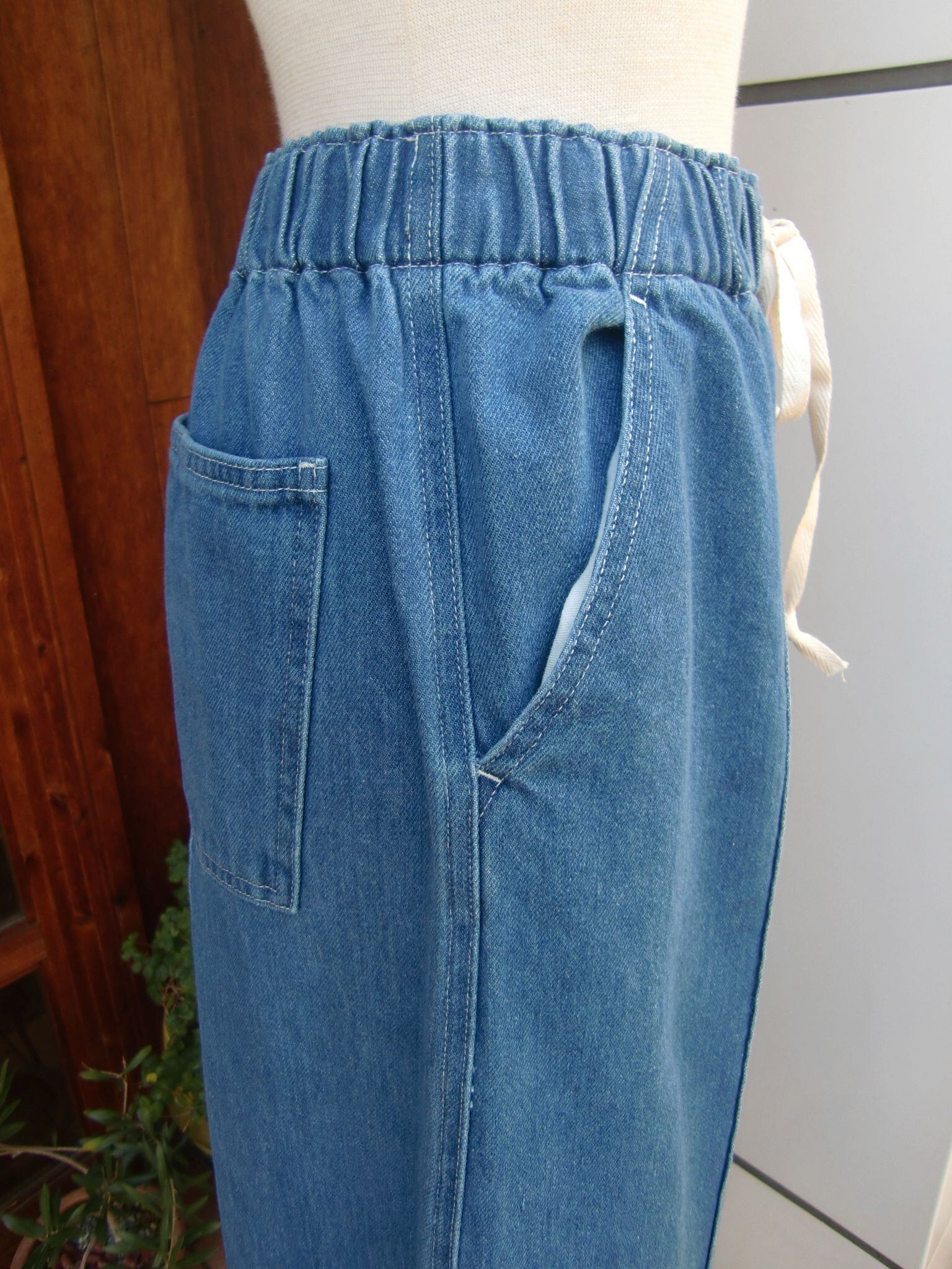ウエストはゴムとスピンドル仕様、ゆったりした脚のラインと相まってノンストレスな穿き心地です。
