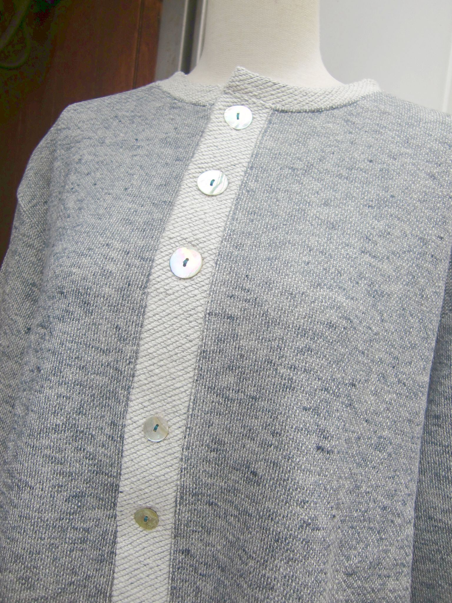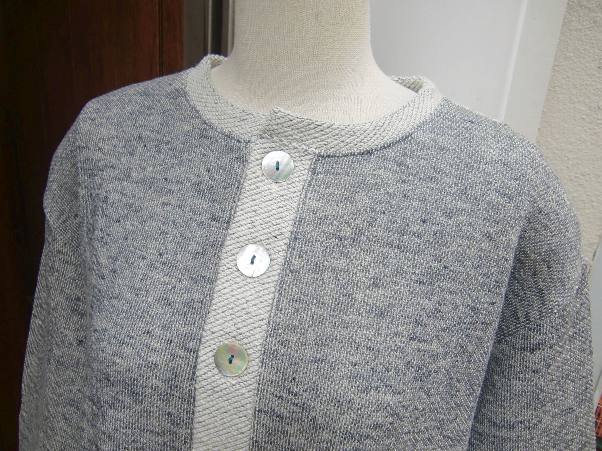 カジュアルな裏毛素材ですが、上三つの大きめ貝ボタンと下二つの小さめ貝ボタンが