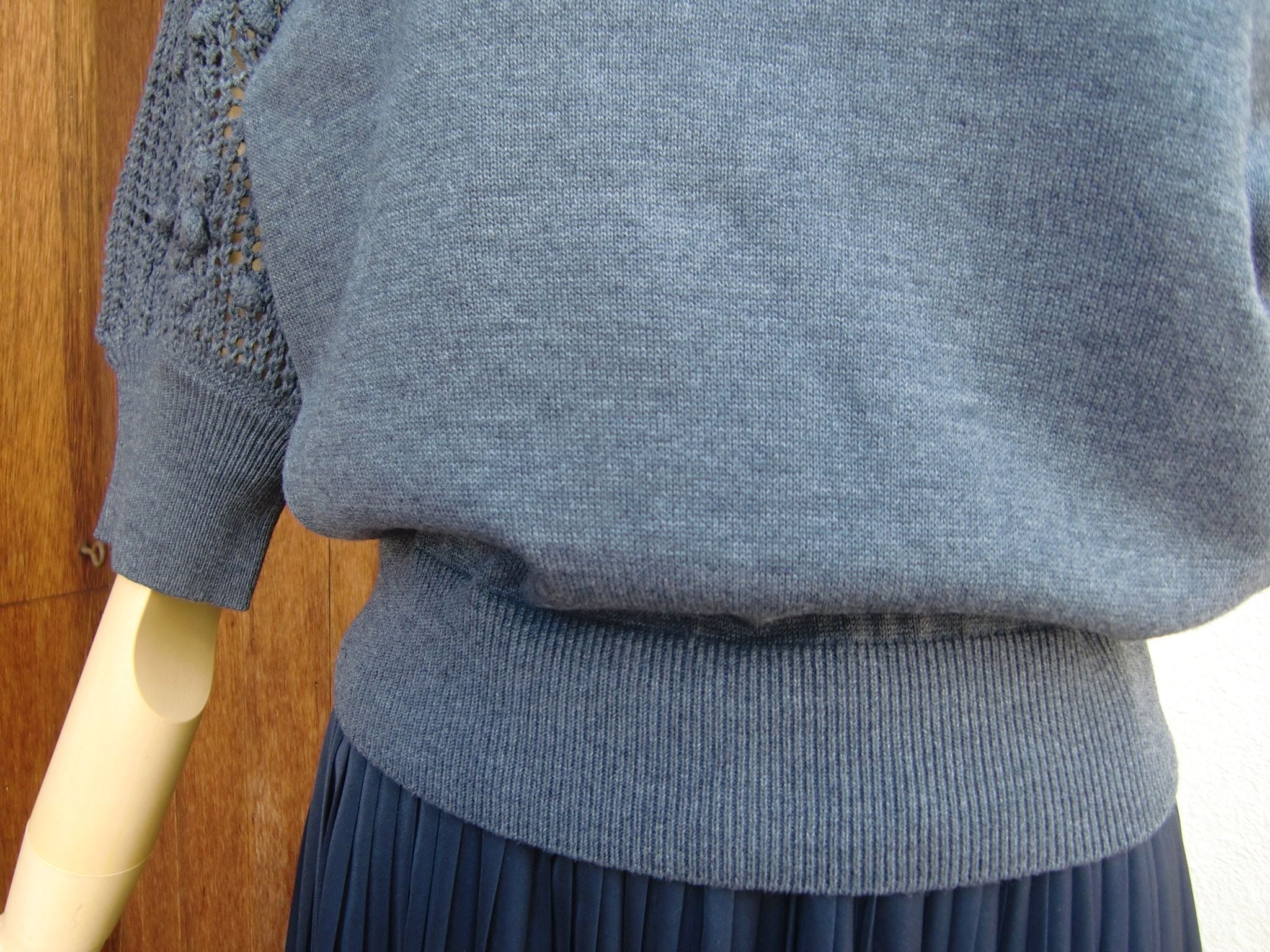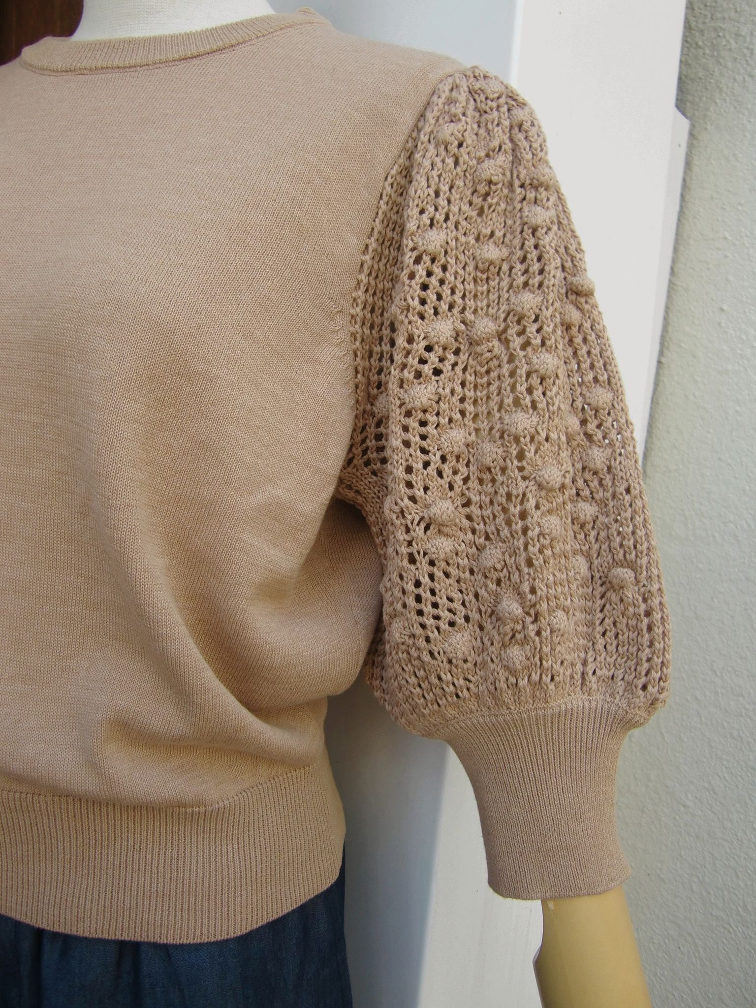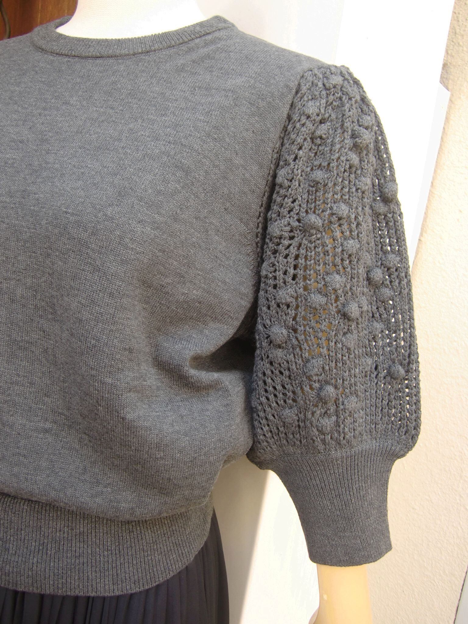 模様編み+ポコポコ編みの立体的な袖に、ボディはショートレングスのコンパクトなつくりで