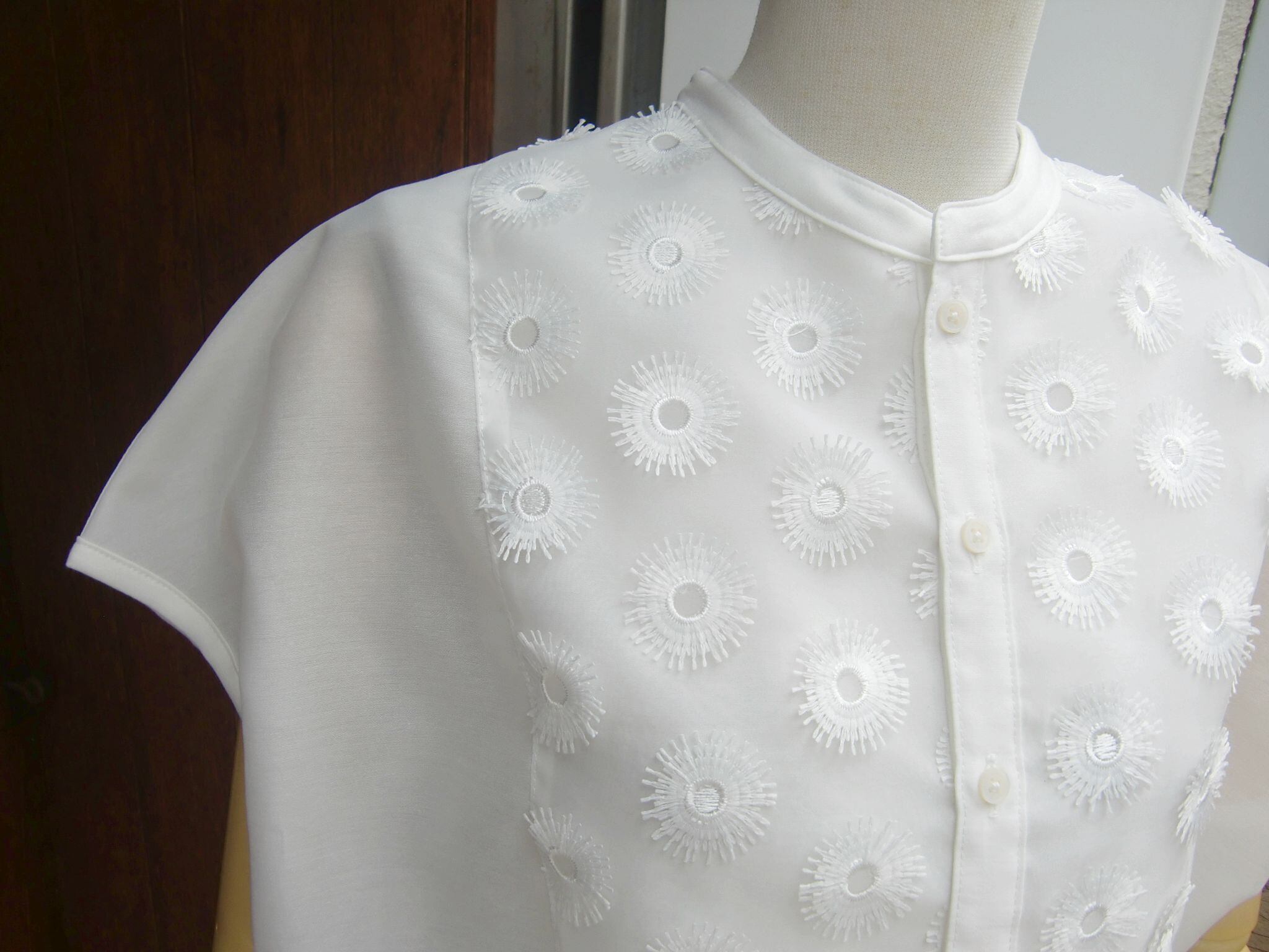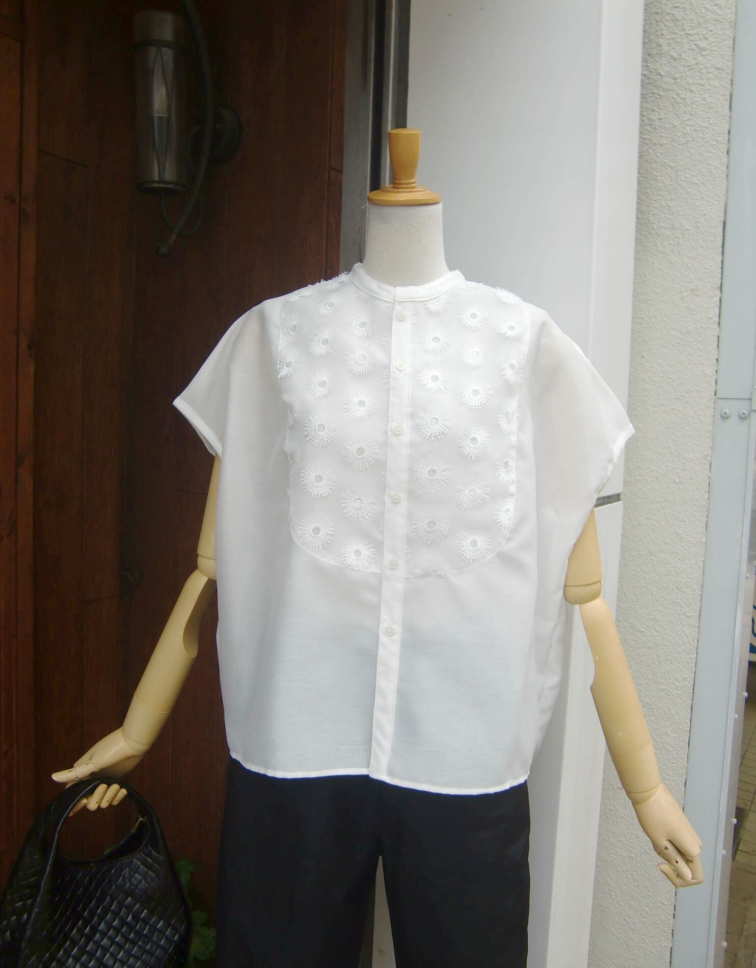フロント切り替えのフラワー刺繍が清楚な女性らしさを感じさせるブラウスは、