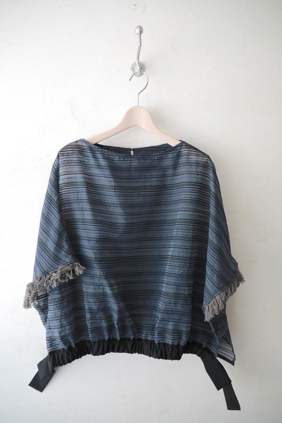 涼し気なシアー感たっぷりのボディにスッキリしたボートネックと袖口のフリンジ、