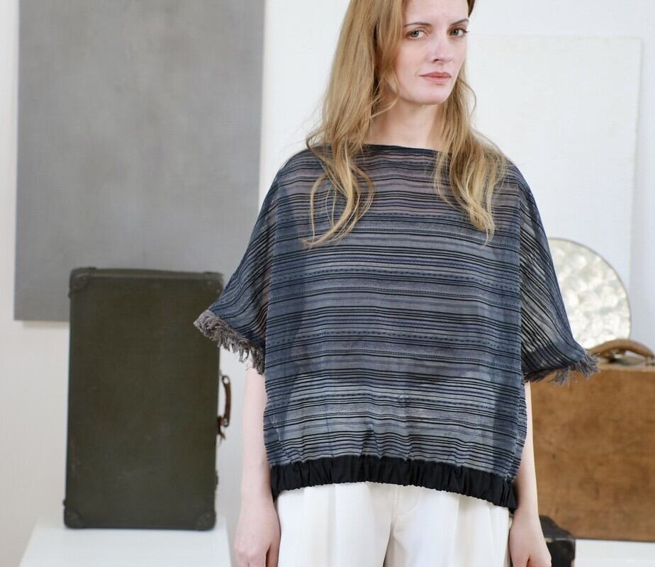オリジナルのストライプジャガード生地を横使いにした≪ラプカルソン≫プルオーバーブラウス。
