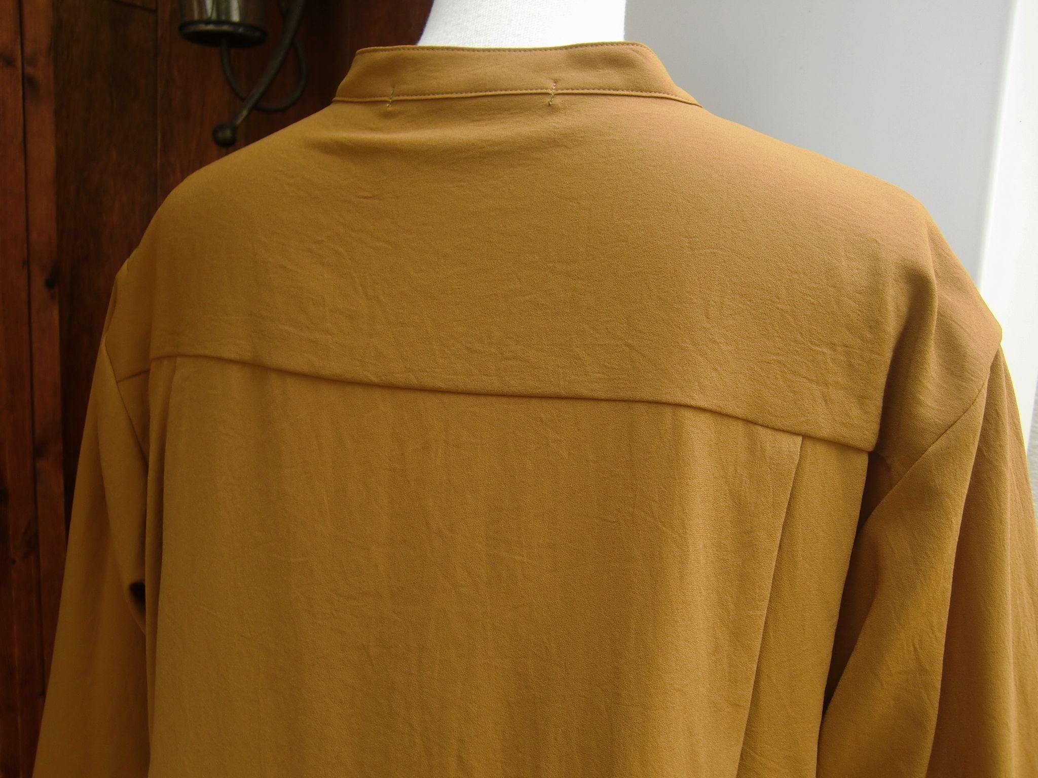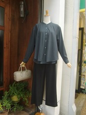 前身頃を斜めに切り替え、フレアを入れたパーツを上に乗せた2枚重ねのデザインが秀逸。