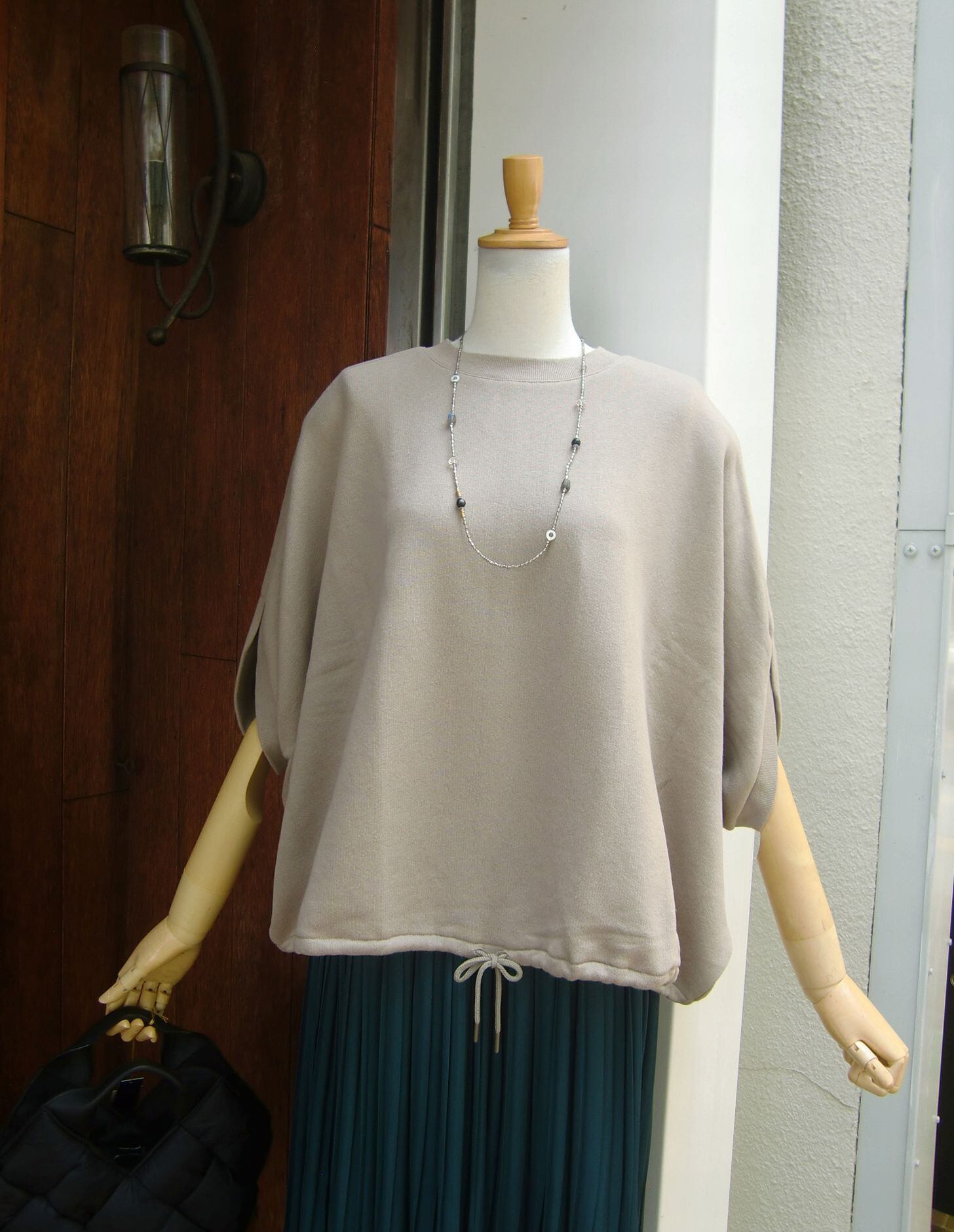 分量感のあるトップスですが、袖口が広めに開いているので一枚で着ると涼し気に見え