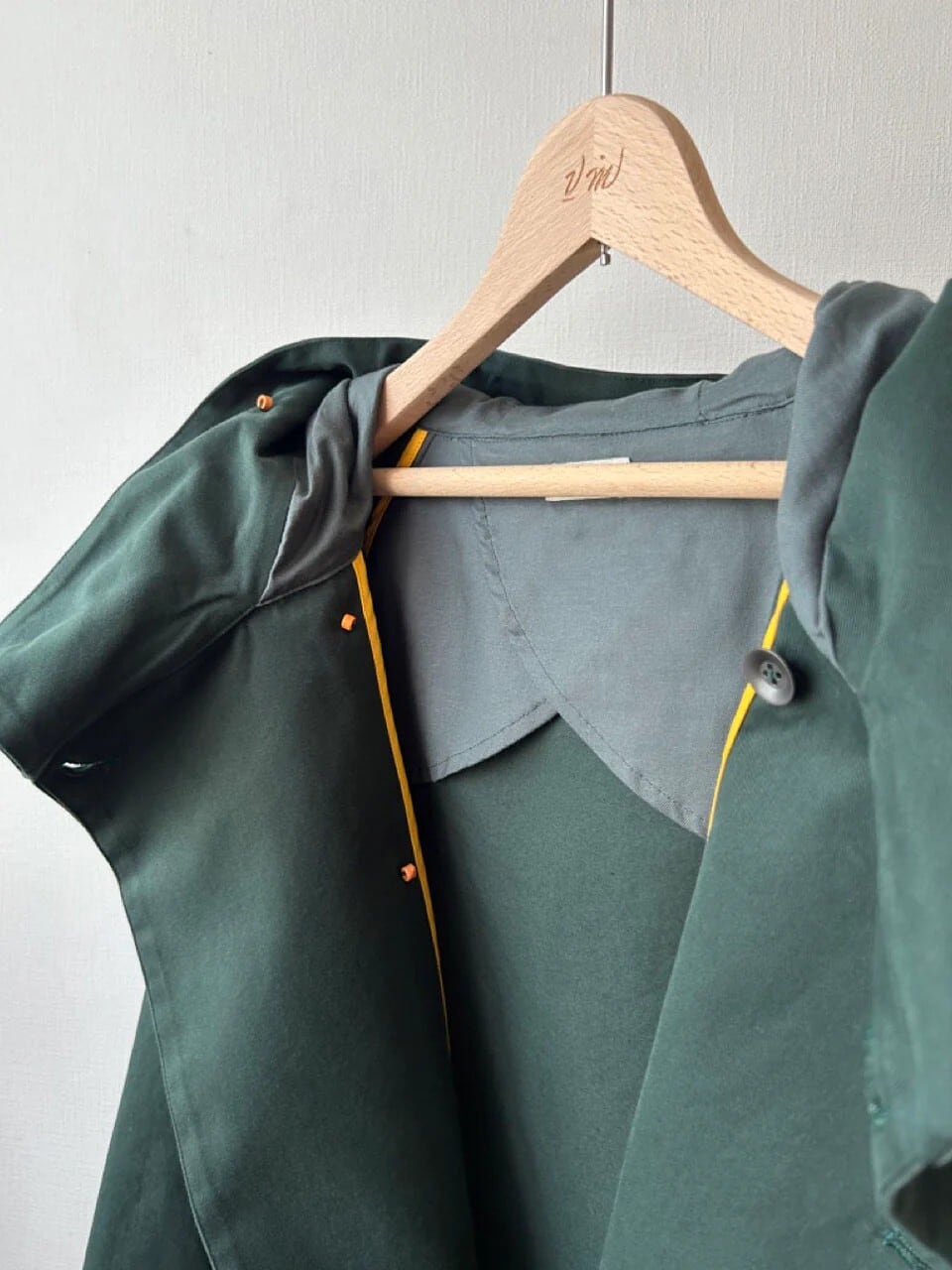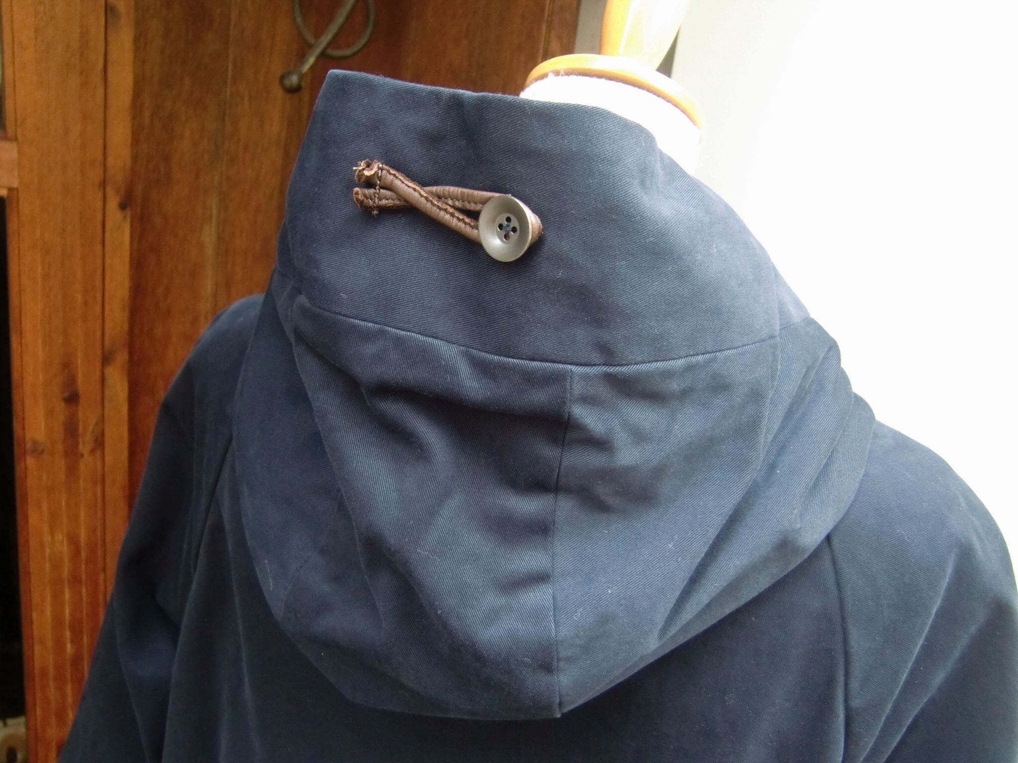 前から見るとスタンドカラーで大人っぽく、でも後姿はフードでカジュアルに、
