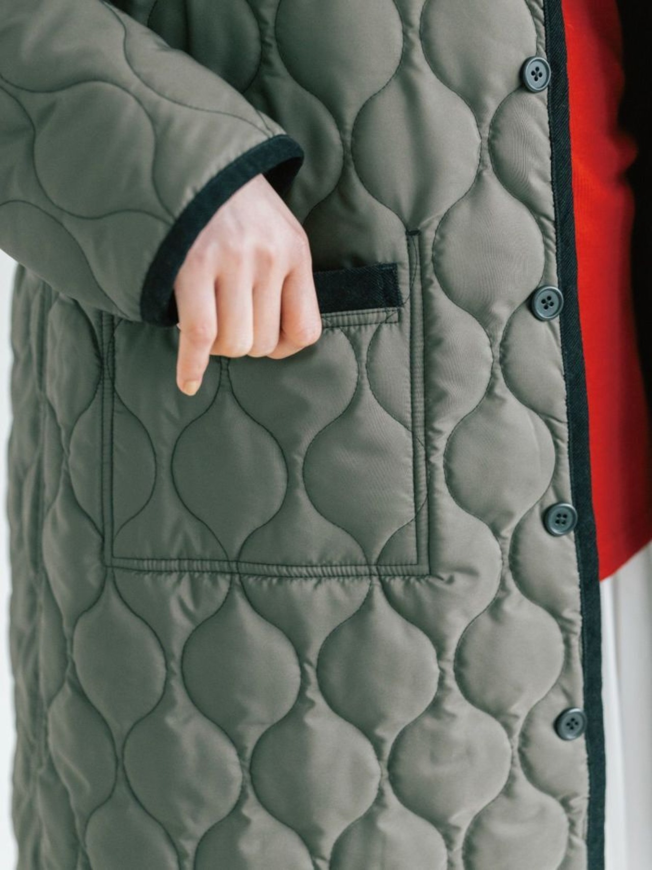ポケット口にもあしらい、肌に触れる部分にはぬくもりと上質な手触りをプラスしています。