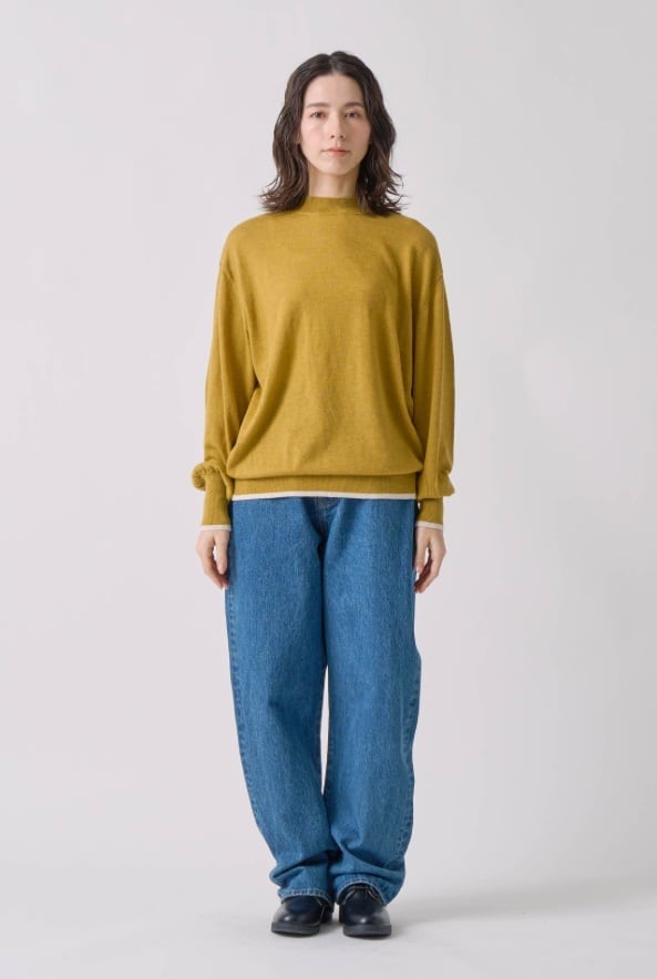 ◇ウール混の混紡糸を使い、天竺編みのフラットな目面で仕立てた柔らかニット。