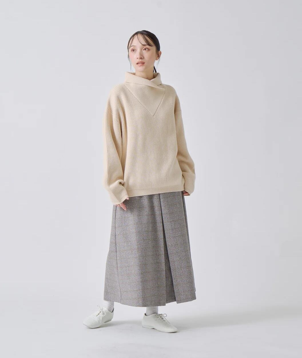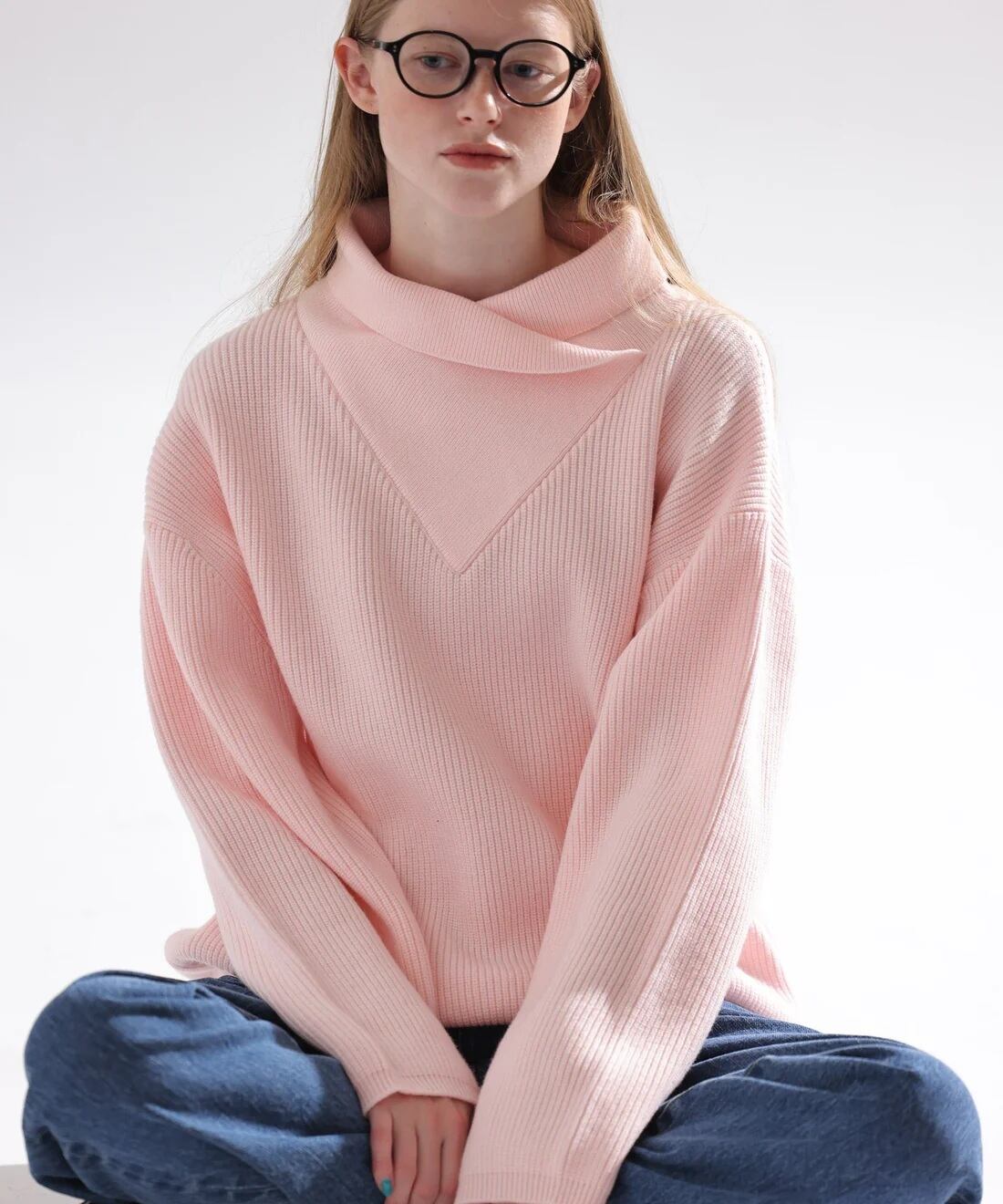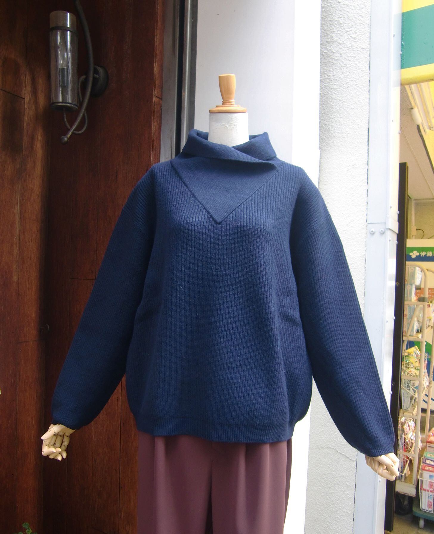 変形の衿が印象的なボックスシルエットニット。