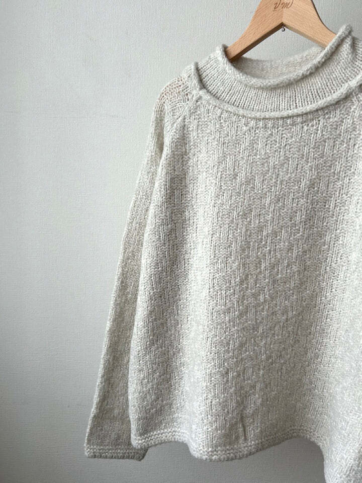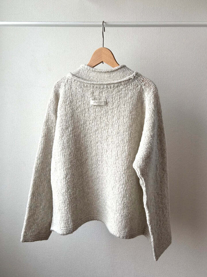 ◇細番手のウールを使用したスポンジッシュな紡毛糸とウールブークレーの糸を組み合わせ、ソフトで膨らみがあり軽量感のあるニットに編み立てた一枚。