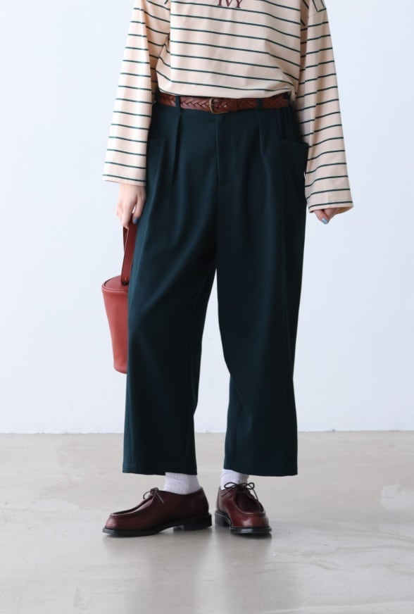 ◇程よい厚みのポリエステル×レーヨン素材を使ったテーパードトラウザーです。