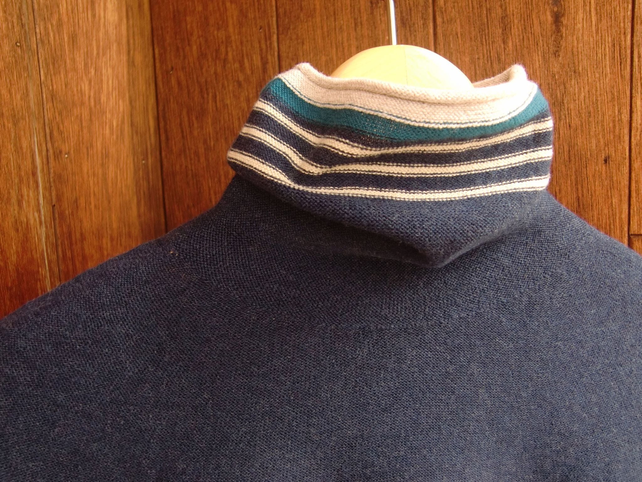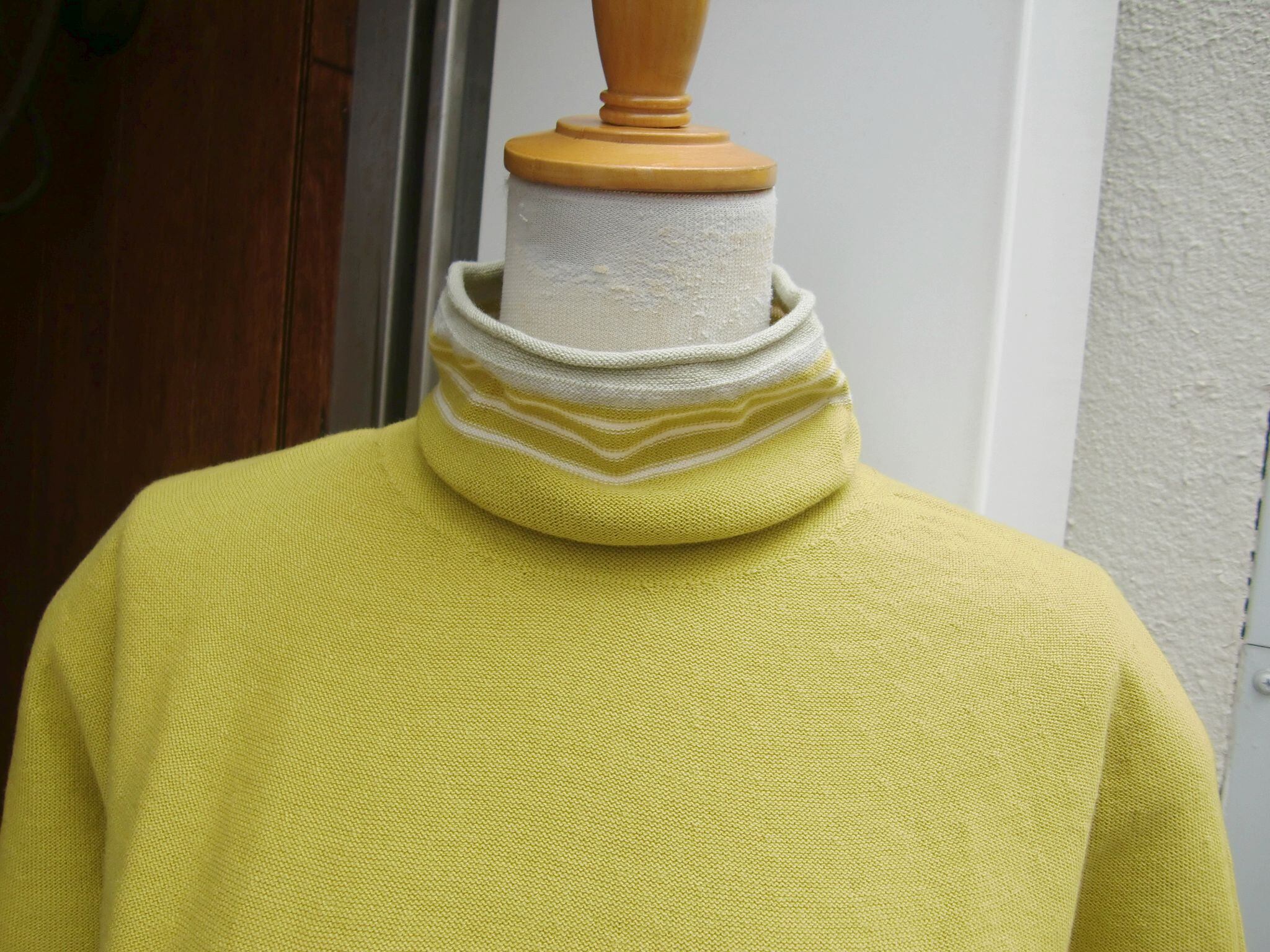 いつもの求心編みオフタートルは、衿上部に均等ではないボーダーをデザイン。