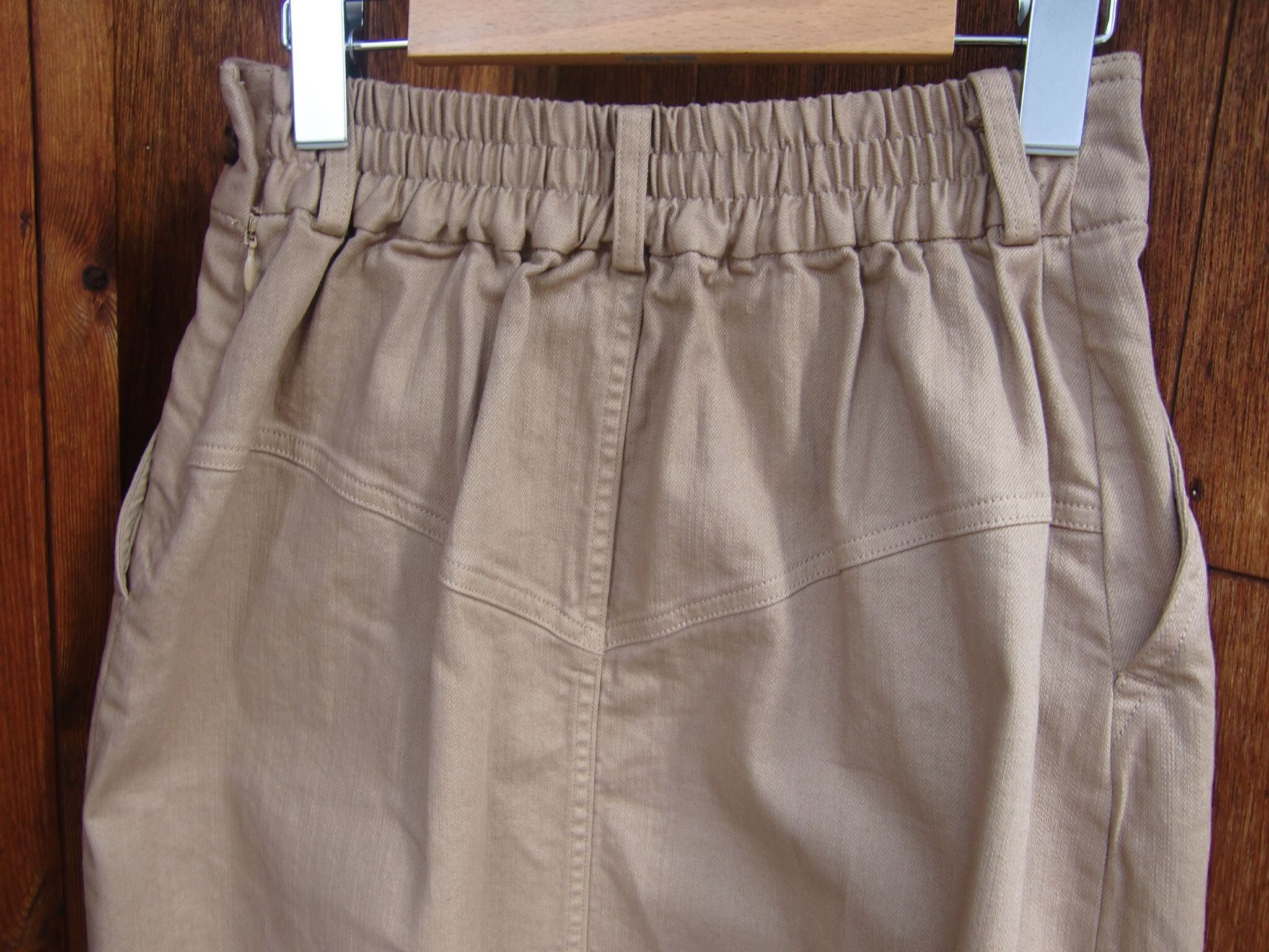 脇スラッシュポケット、後ろウエストはゴム仕様です。