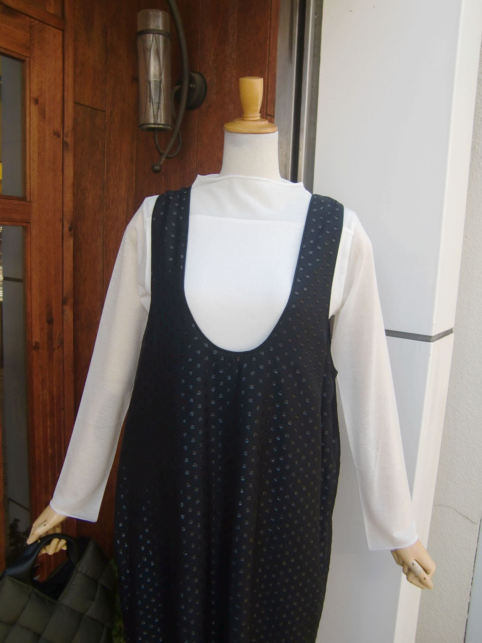 ドット柄はシアー感と光沢感があり、素材が印象的な一着。