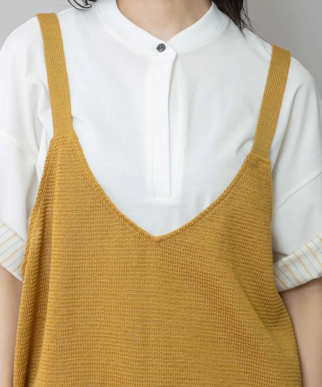 身幅もゆったりとしたサイジングで仕上げたキャミ型のニットタンクトップ。