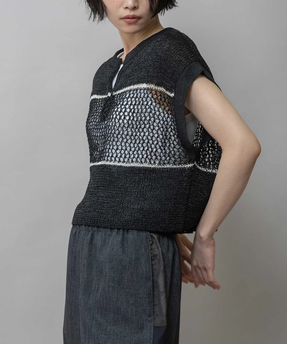 ◇配色ラインがアクセントになった清涼感のあるスカシ編みニットジレ。