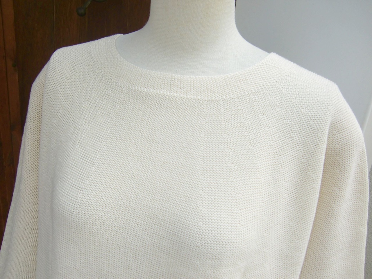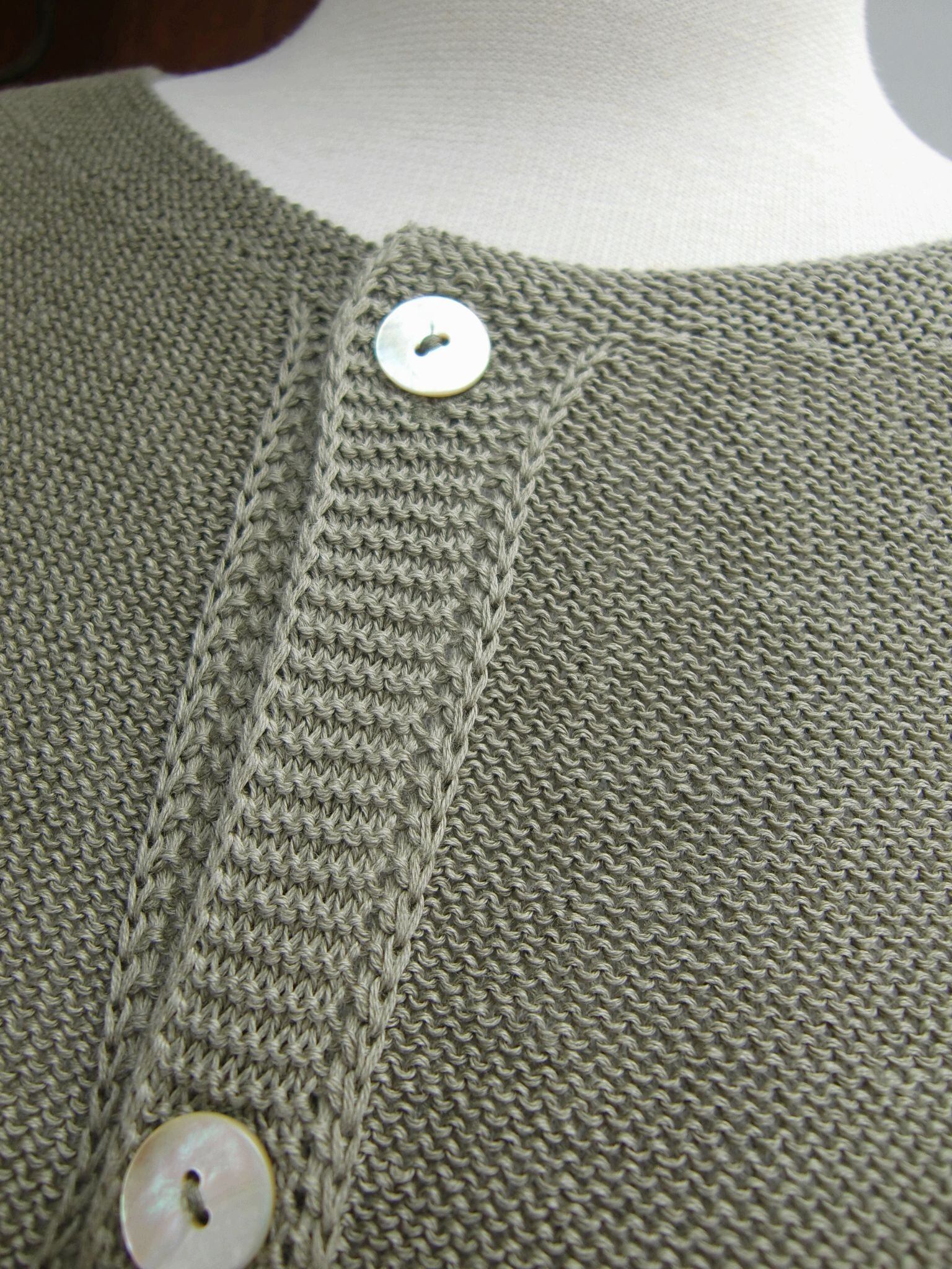衿の形状が中心に向かって細くなっていたり、衿ぐりの編みが求心状になっていたりと