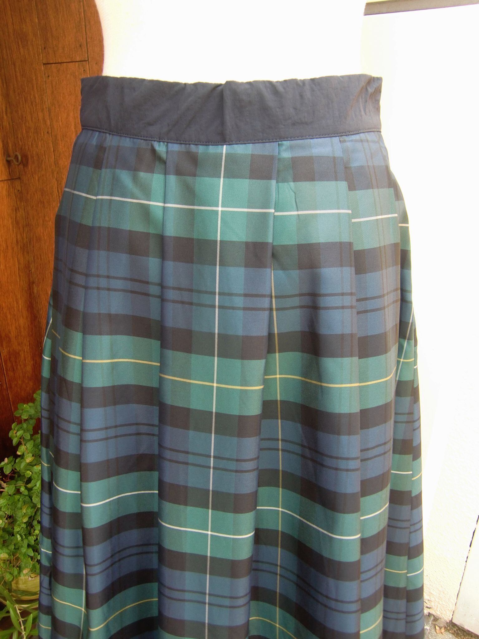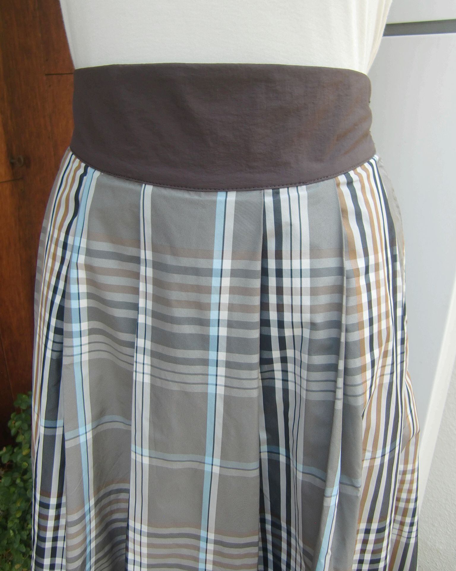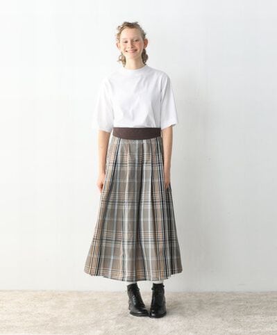 スカートは大胆なチェック柄にタック使いでポイントを付けたAラインシルエット。