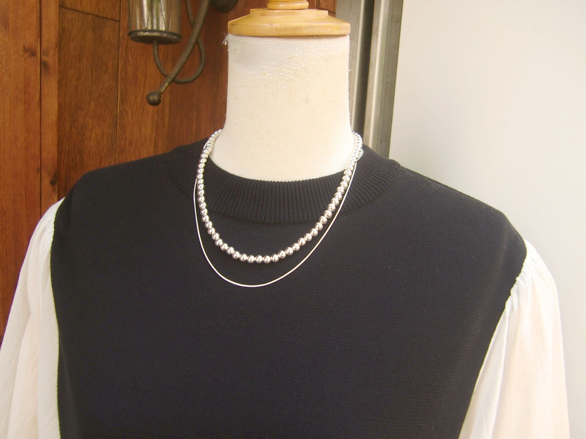 ◇存在感のあるボールチェーンとシンプルなチェーンの2連ネックレス。