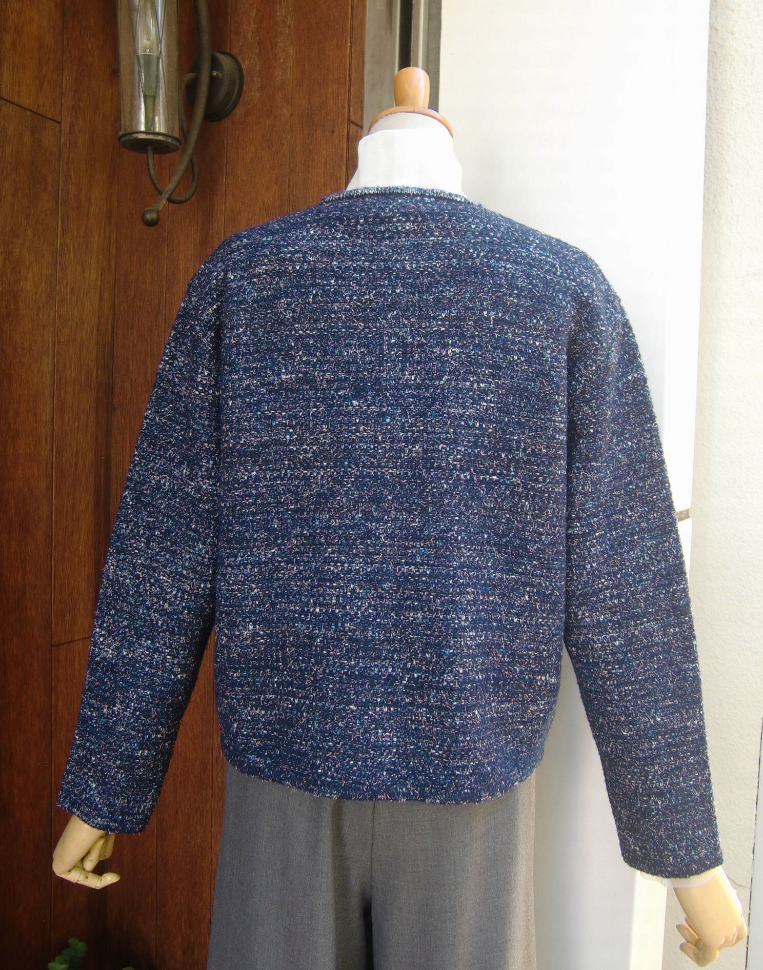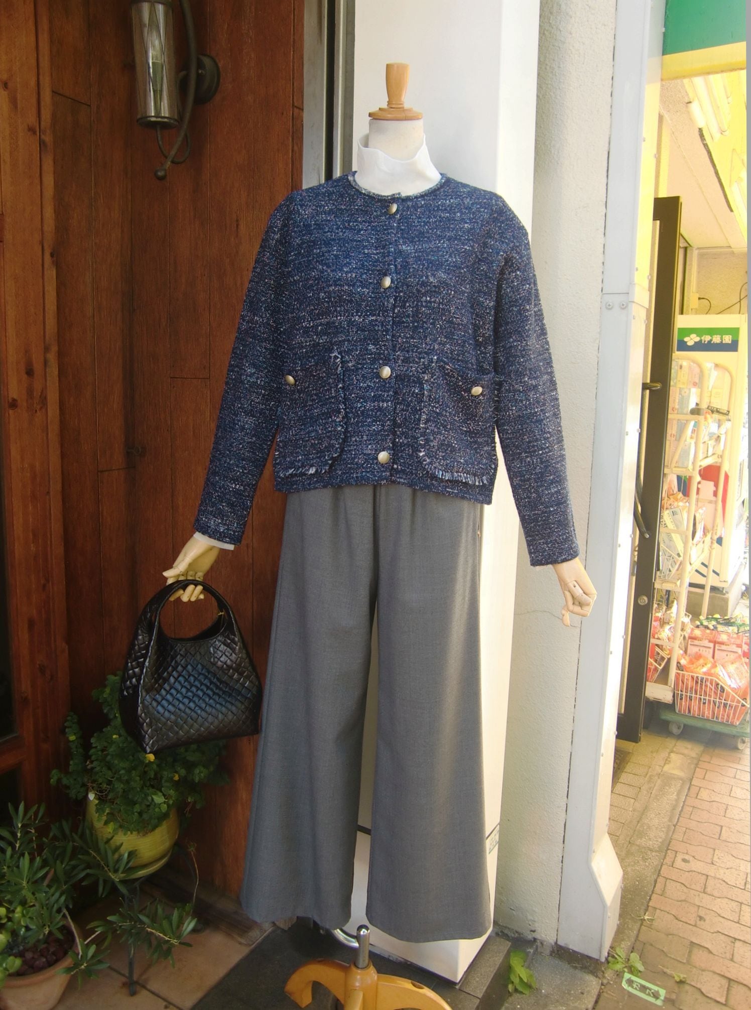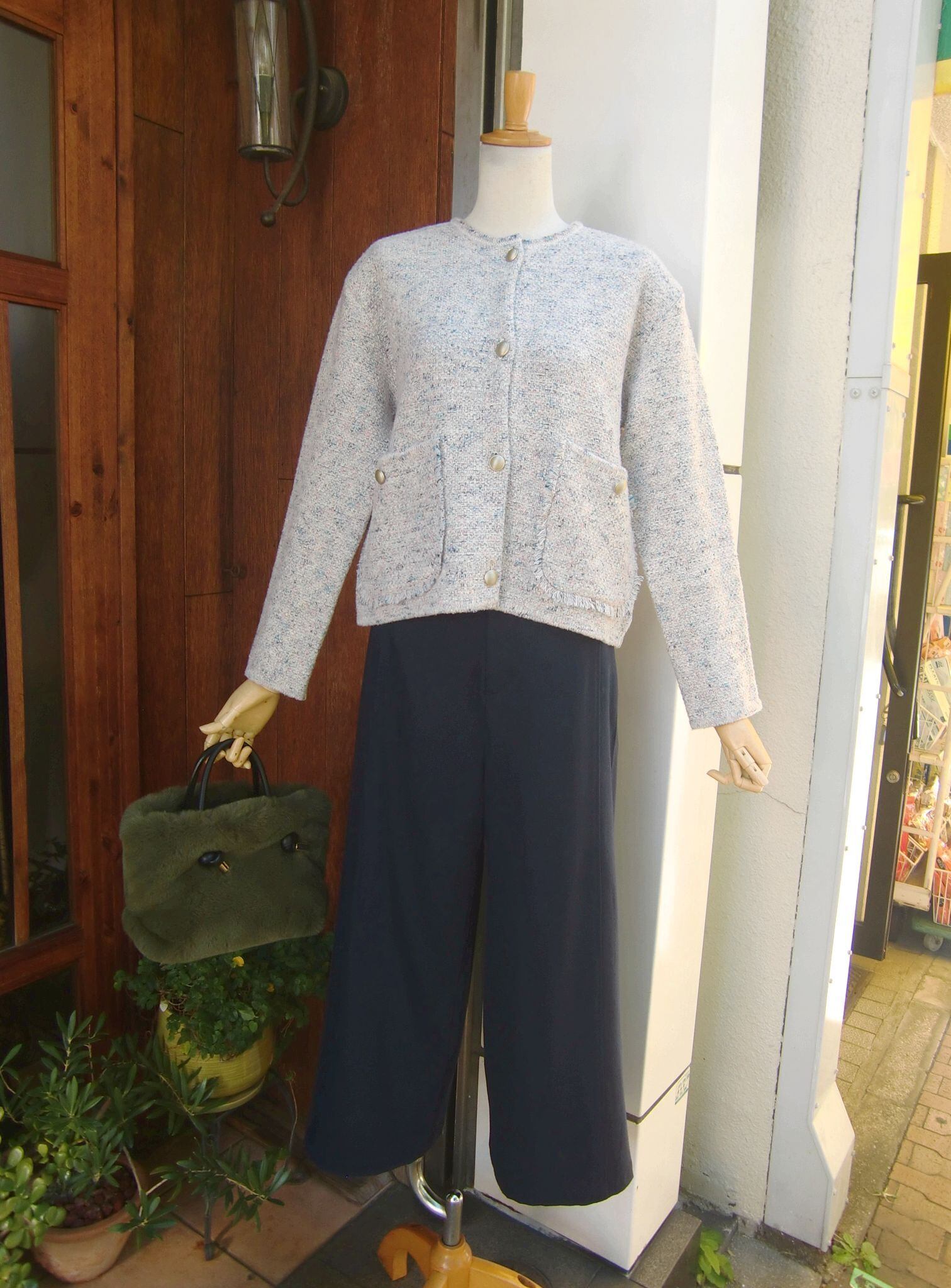 ◇ウールブークレー、絣スラブ、ウールの3素材を組み合わせて編み立てた