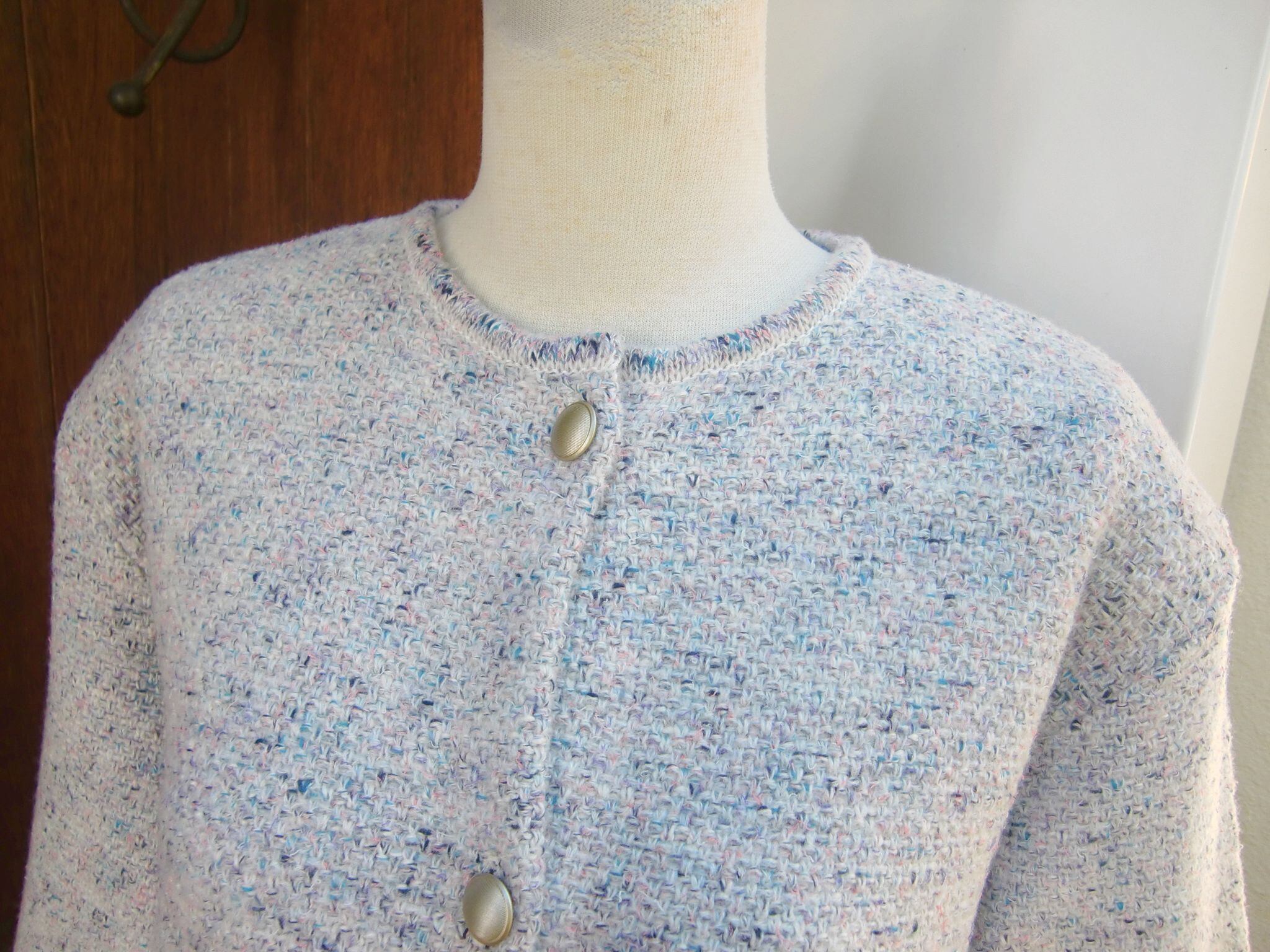 ≪エマキュレイト≫ツィード調ニット。素材の組み合わせと編地の表面効果で華やかな印象に。